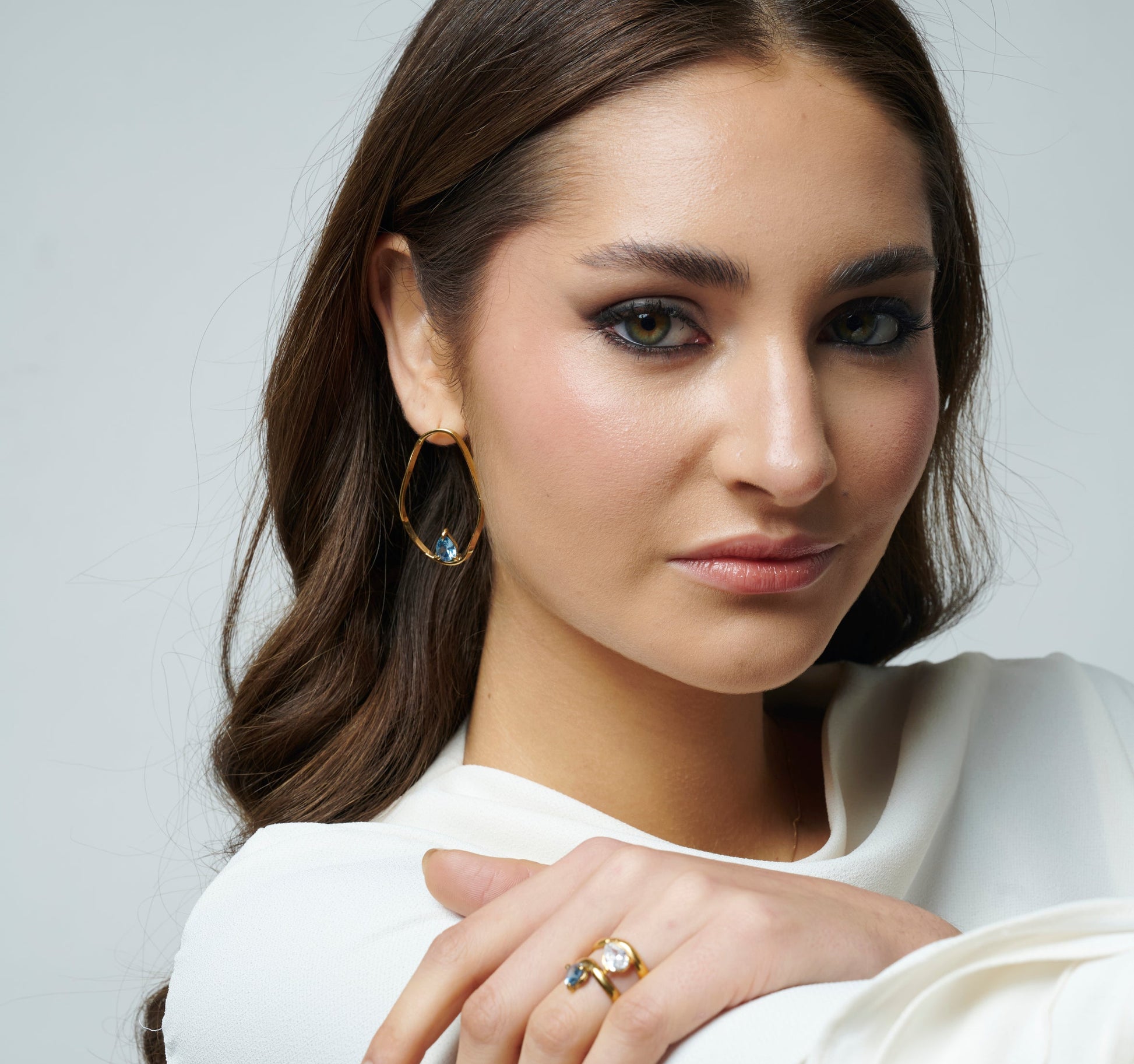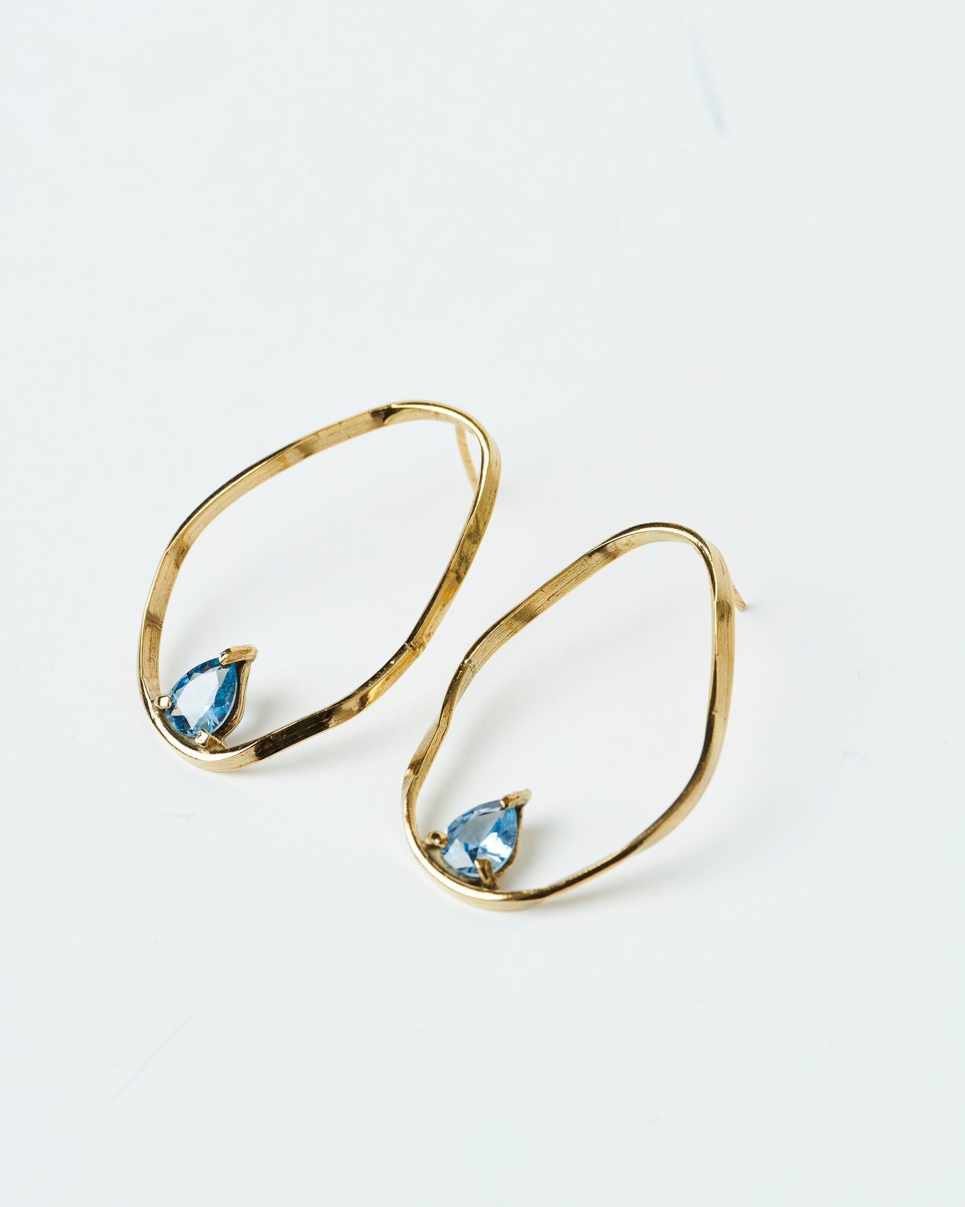 Aros hecho a mano en bronce con baño de oro 24k y engaste artesanal. La piedra central, un circón azul con corte gota, aporta un brillo clásico que contrasta con la textura orgánica del aro.