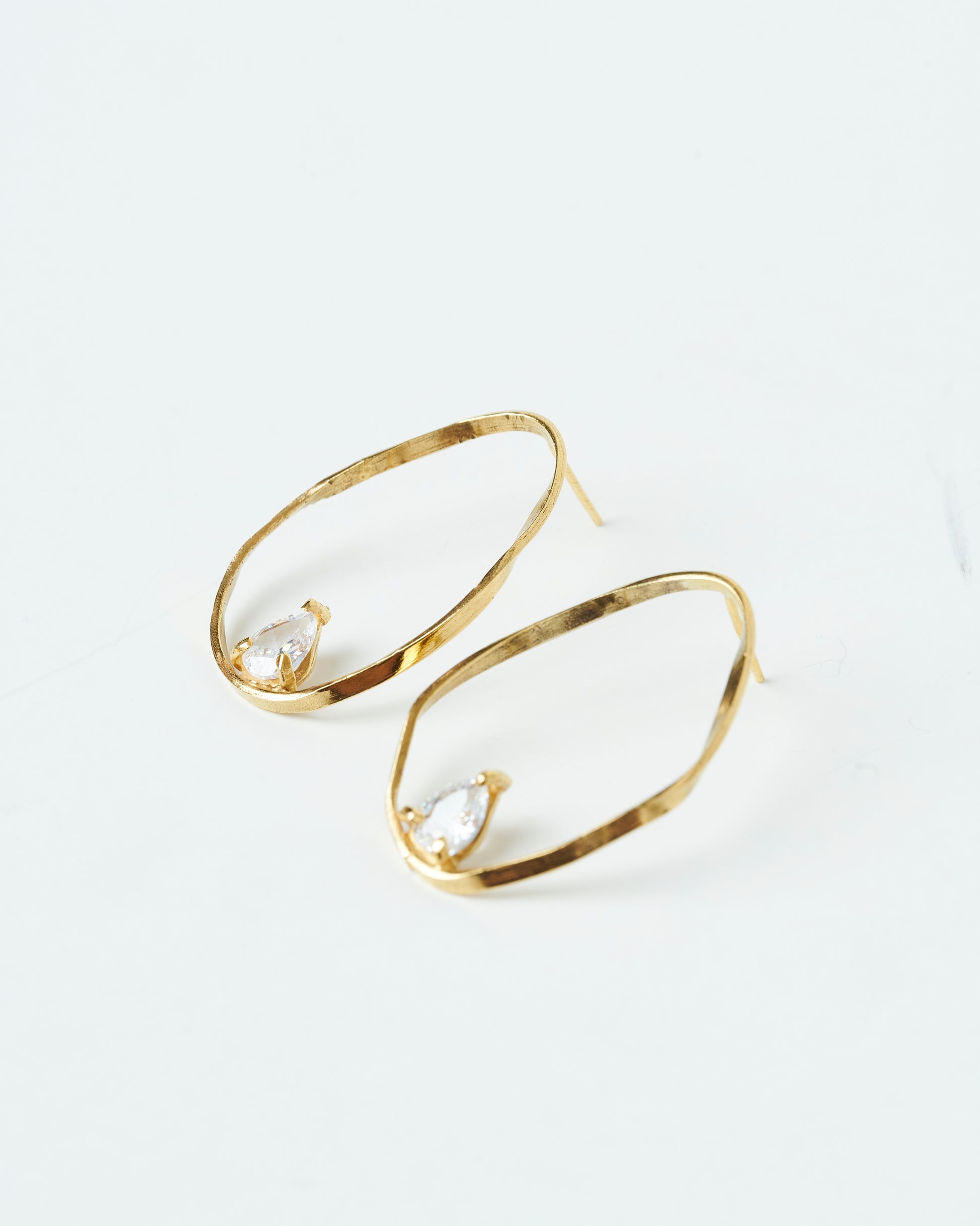 Aros hecho a mano en bronce con baño de oro 24k y engaste artesanal. La piedra central, un circón blanca con corte gota, aporta un brillo clásico que contrasta con la textura orgánica del aro.