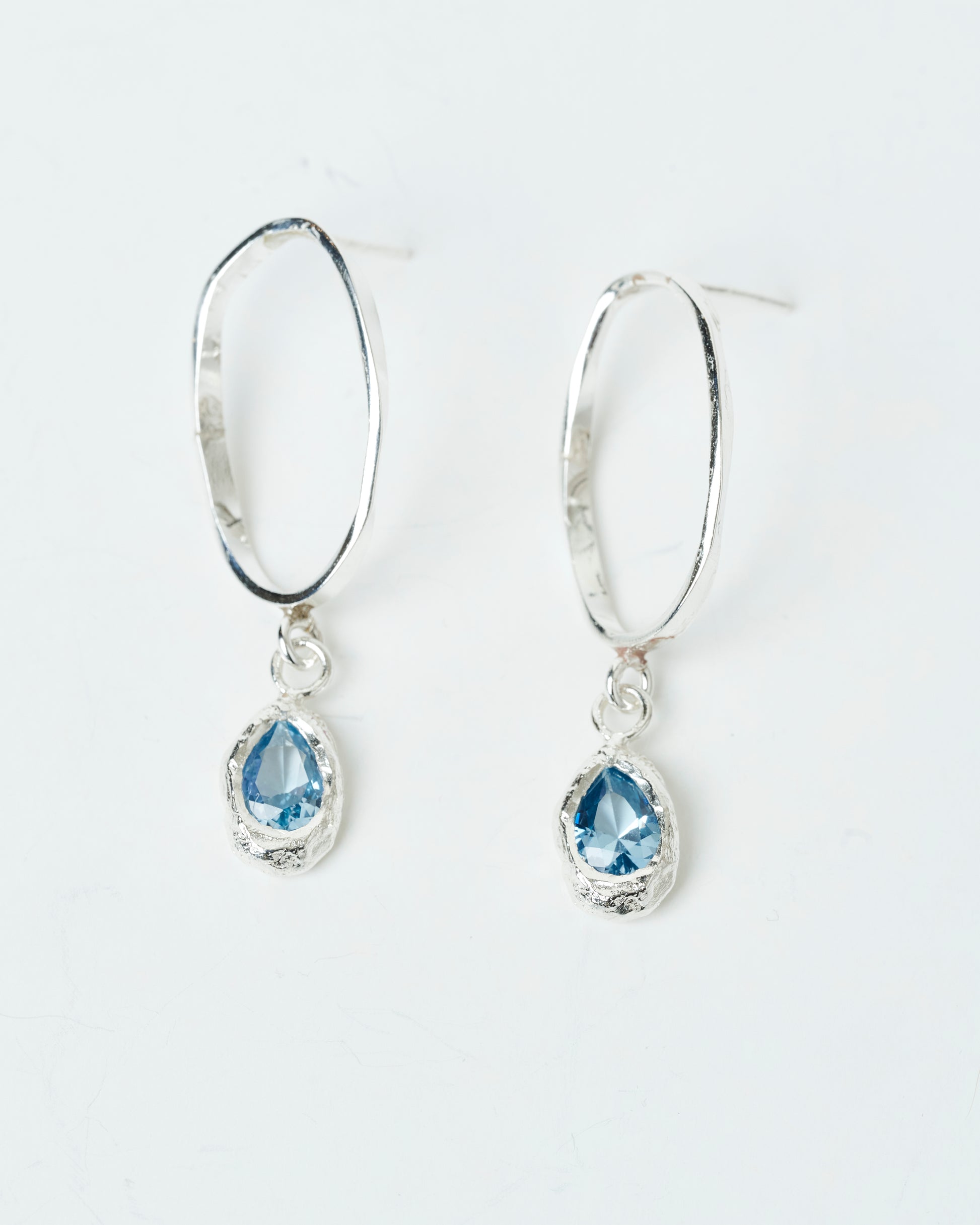 Los Aros Mera son parte de la nueva colección, hechos a mano en plata 950, con circones azules engastados. Una pieza única y atemporal.